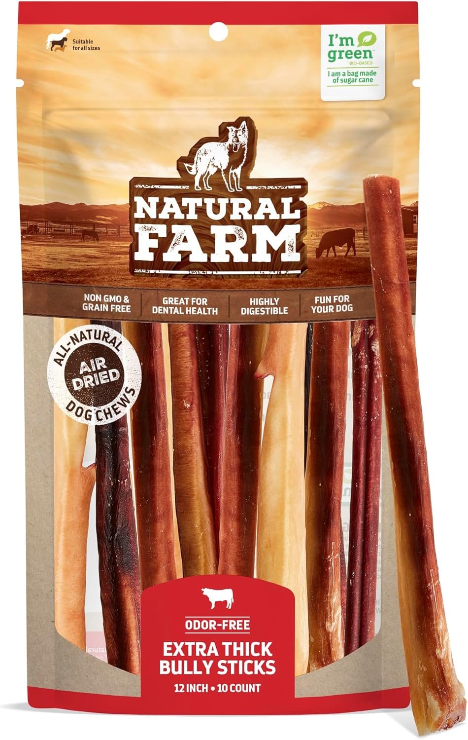 Natural Farm Extra-Thick 12-Inch Beef Bully Sticks Dog Chews (10-Pack) – Odor-Free Dental Treats for Dogs